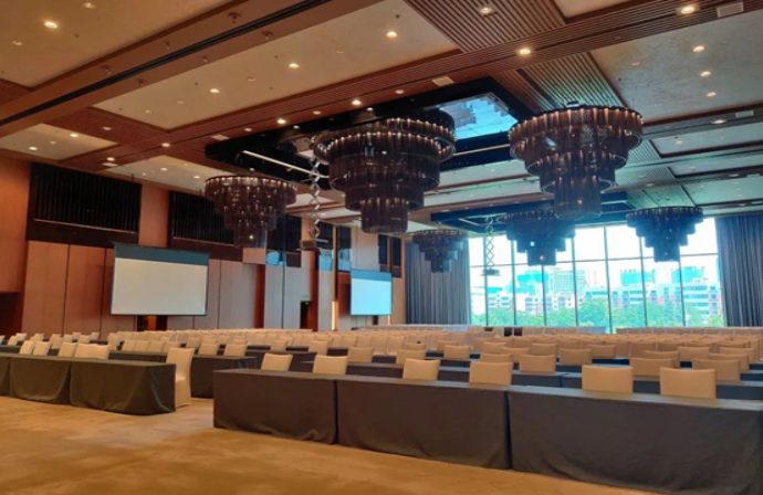 酒店的大宴會廳位于酒店二樓,場地面積1100平米,層高8米。現場擴聲采用了EV的12寸吸頂音箱,均勻的聲場分布,充足的聲壓級,讓大宴會廳舉辦的活動,無論是會議還是宴會,擴聲都得到了保證。因為場地天花內設備管道眾多,施工時使用了更薄的方形箱體,在不破壞裝修的情況下,節省了空間,更加的美觀。