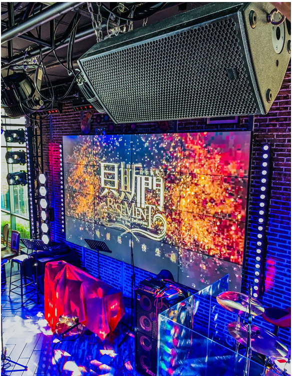 5只JBL PRX815W 15寸有源一體化智能揚聲器作為舞臺監聽, 8只SAL的A6全頻揚聲器根據聲場覆蓋,均勻布置在餐吧各區區域。