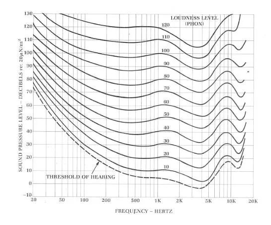 在進(jìn)行聲壓級(jí)計(jì)算前,必須選擇一個(gè)相應(yīng)環(huán)境下合適的基準(zhǔn)聲壓級(jí),而基準(zhǔn)聲壓級(jí)的選擇必須了解正常人耳的等響曲線,即“Fletcher-Munson curves(弗萊徹芒森曲線)”。