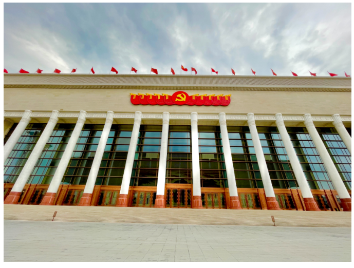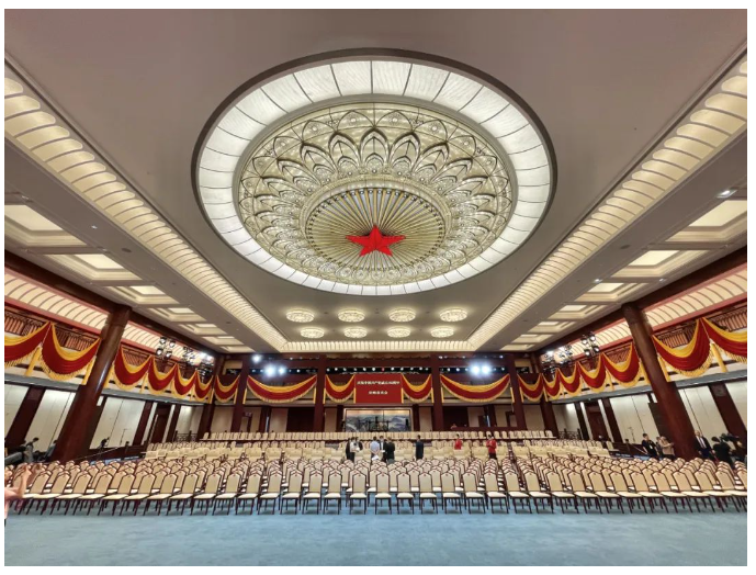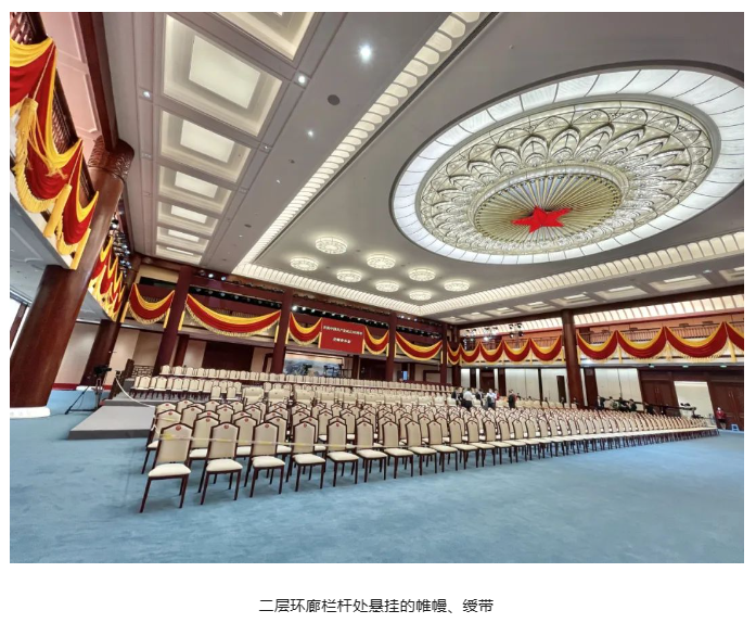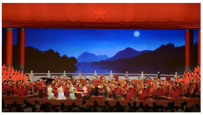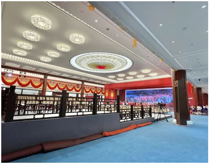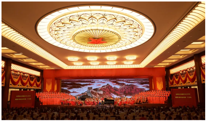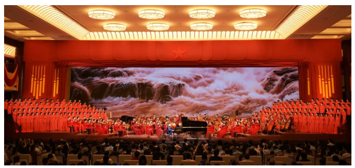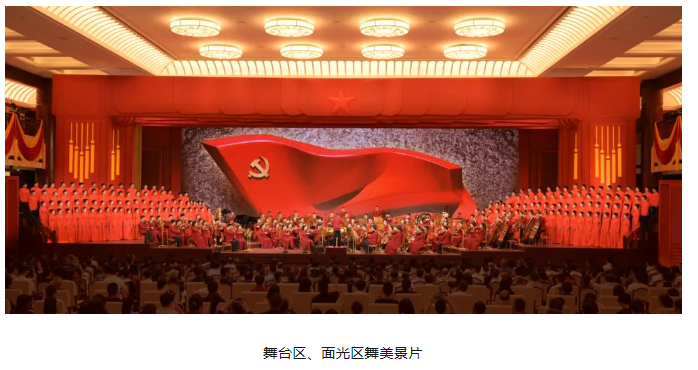 演出當(dāng)晚,紅色大廳燈火通明,用紅旗元素搭建、黃色綬帶裝飾的舞臺(tái)與帷幔一起烘托出慶典氛圍,大廳頂部中央鑲嵌的五角星熠熠生輝。