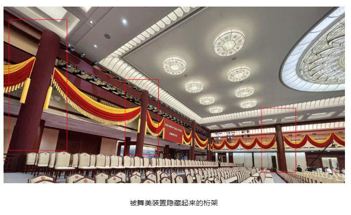 因廳內(nèi)無(wú)吊點(diǎn)可用,上空中央有紅色五角星花燈,大廳四周用立柱分割出環(huán)廊,于是在舞臺(tái)區(qū)搭建了跨度達(dá)29 m的主結(jié)構(gòu)架,用于固定舞美景片及吊掛燈具。舞臺(tái)背景使用紅色五角星的門頭造型,三重門柱依次向舞臺(tái)縱深排布,舞臺(tái)后端設(shè)置了P2高清LED屏幕。廳內(nèi)兩側(cè)回廊前搭設(shè)一組細(xì)長(zhǎng)的結(jié)構(gòu)架,裝飾金色麥穗以及弧形布縵。在觀眾席的最后排位置搭建了一組高度9 m、跨度28 m的多立柱結(jié)構(gòu)龍門架,同樣與舞美設(shè)計(jì)一并進(jìn)行整體裝飾,把結(jié)構(gòu)架隱密在現(xiàn)場(chǎng)環(huán)境中,使之在視覺(jué)形象上成為場(chǎng)地本身的一部分。