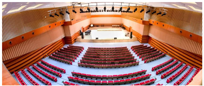 “琴島”音樂廳建筑面積2100平方米,內(nèi)部結構呈扇形狀,扇形音樂廳的天頂呈等勢的遞進,目的是令聲學能量均勻擴散。在這種音樂廳中,聲樂的直接信號更容易送達。